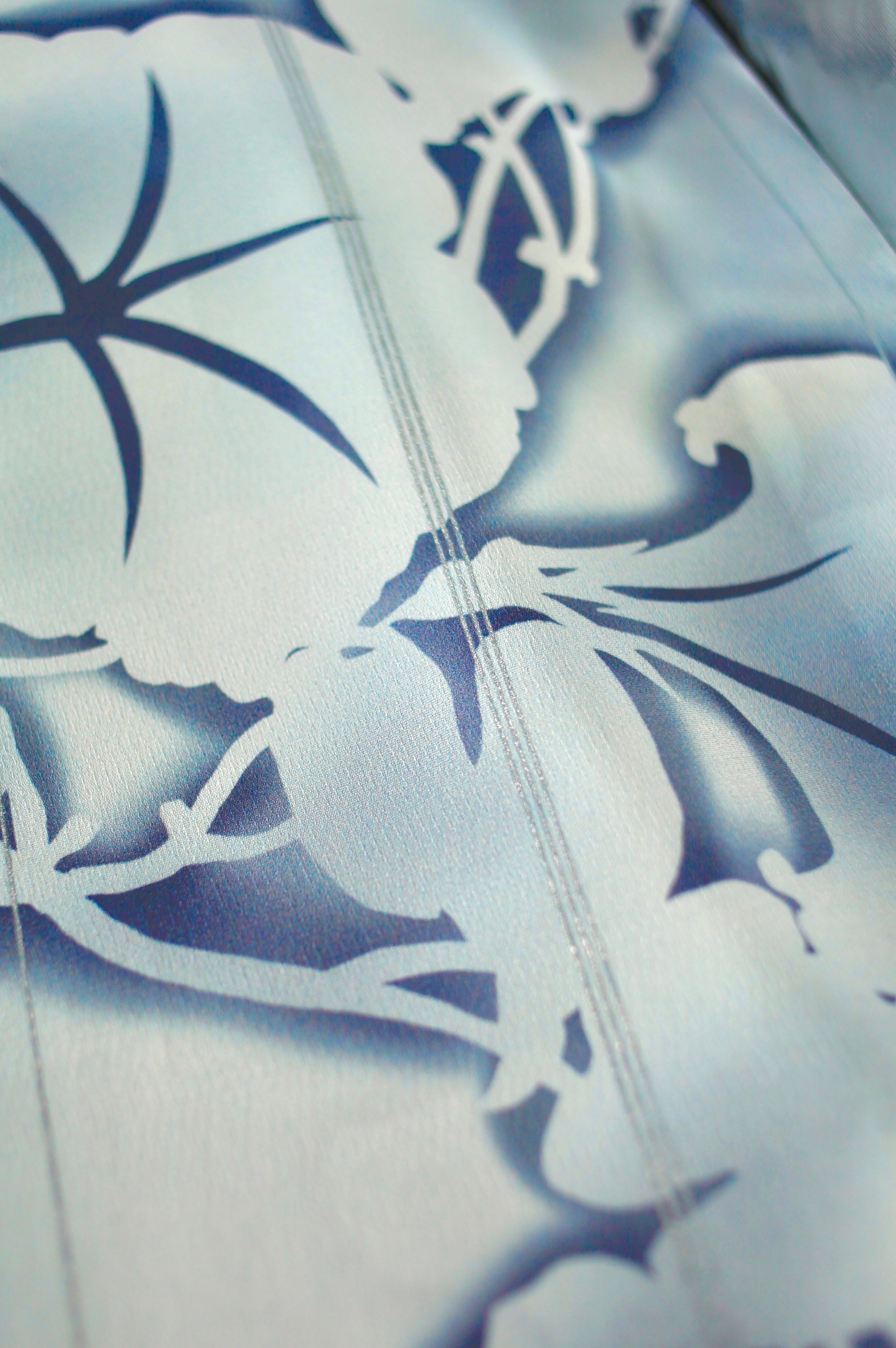 夏着物「朝顔シルエット」の、上前にのみ、銀線加工を手描きでお入れいたします。